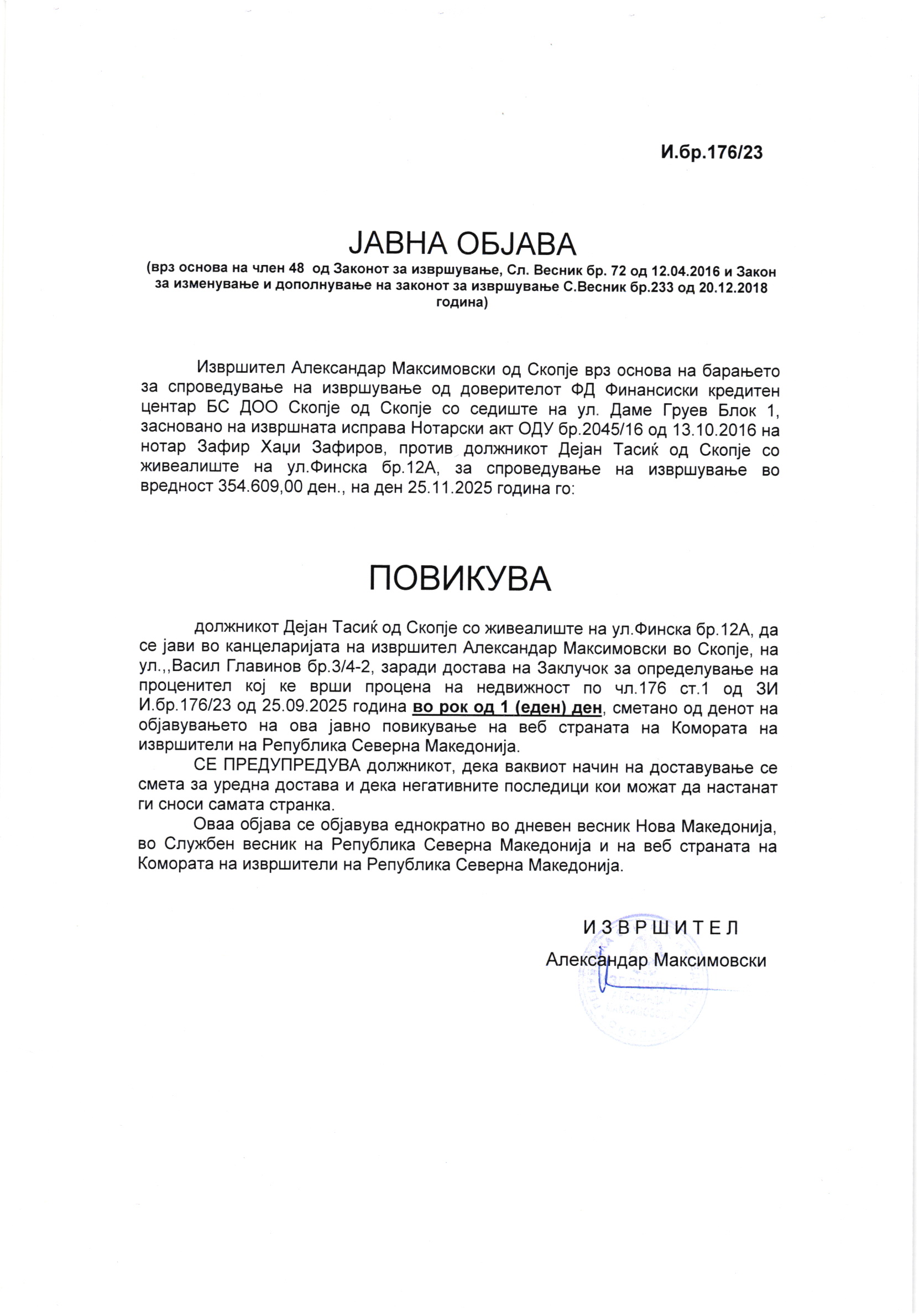 Повикувањето е заради достава на: Заклучок за определување на проценител кој ке врши процена на недвижност по чл.176 ст.1 од ЗИ И.бр.176/23 од 25.09.2025 година.